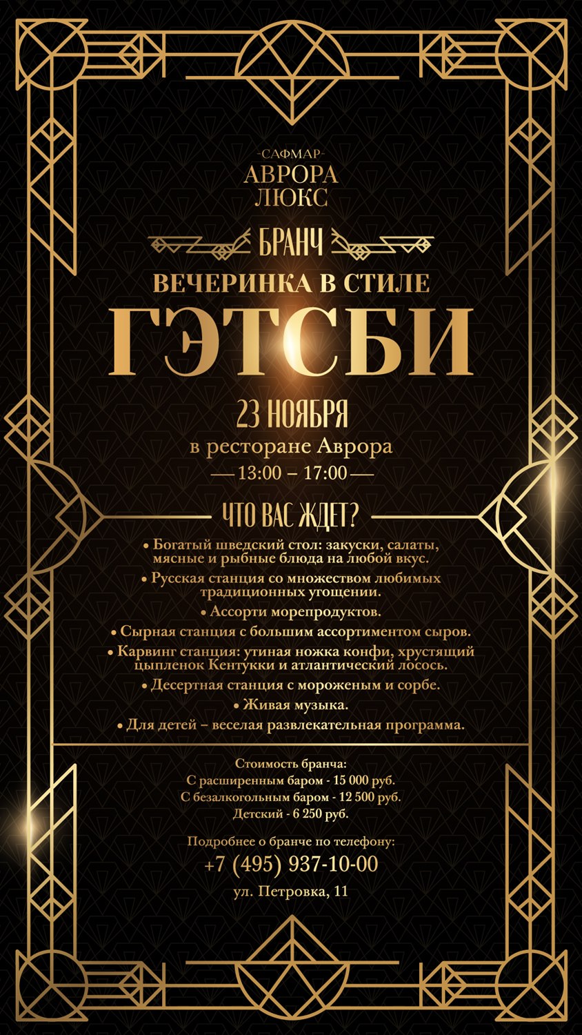 Блестящая роскошь и беззаботное веселье, воспетые в романе писателя Фрэнсиса Скотта Фицджеральда «Великий Гэтсби», породили особый стиль – стиль Гэтсби. Его лозунг: «Жизнь – это праздник», – отлично подходит для очередного тематического бранча в отеле. Ведь хорошо известно, что «Сафмар Аврора Люкс» был одним из первых отелей в столице, который ввел моду на традиционный воскресный семейный обед, где праздничная атмосфера является его неотъемлемой частью.