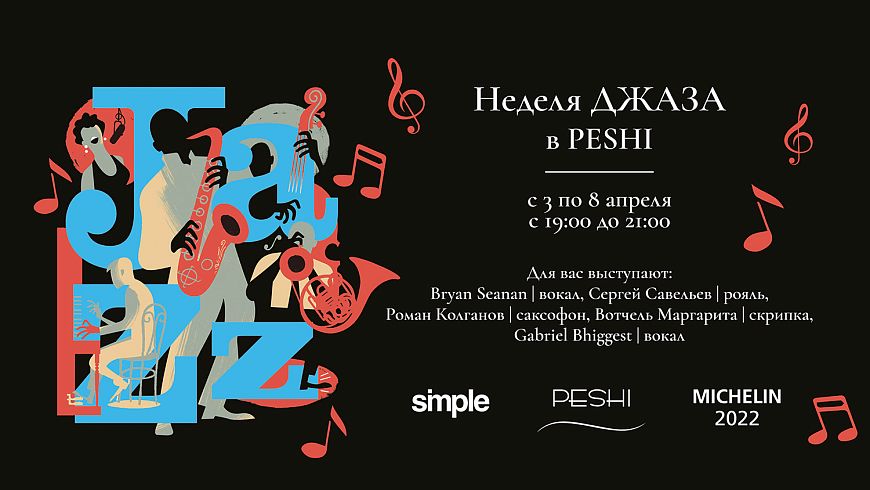 Неделю с 3 по 8 апреля ресторан PESHI посвящает бархатистому вокалу, очаровывающему саксофону, пронзительной скрипке и волнительным звукам рояля, а именно — джазу!